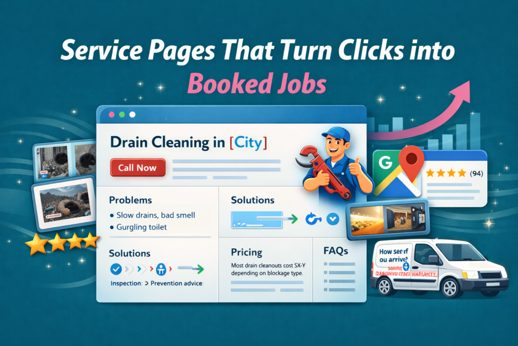 A strong service page answers the customer’s question fast, proves you’re credible, and makes calling frictionless. Use clear sections: problems, solutions, pricing ranges, service area, reviews, and FAQs.